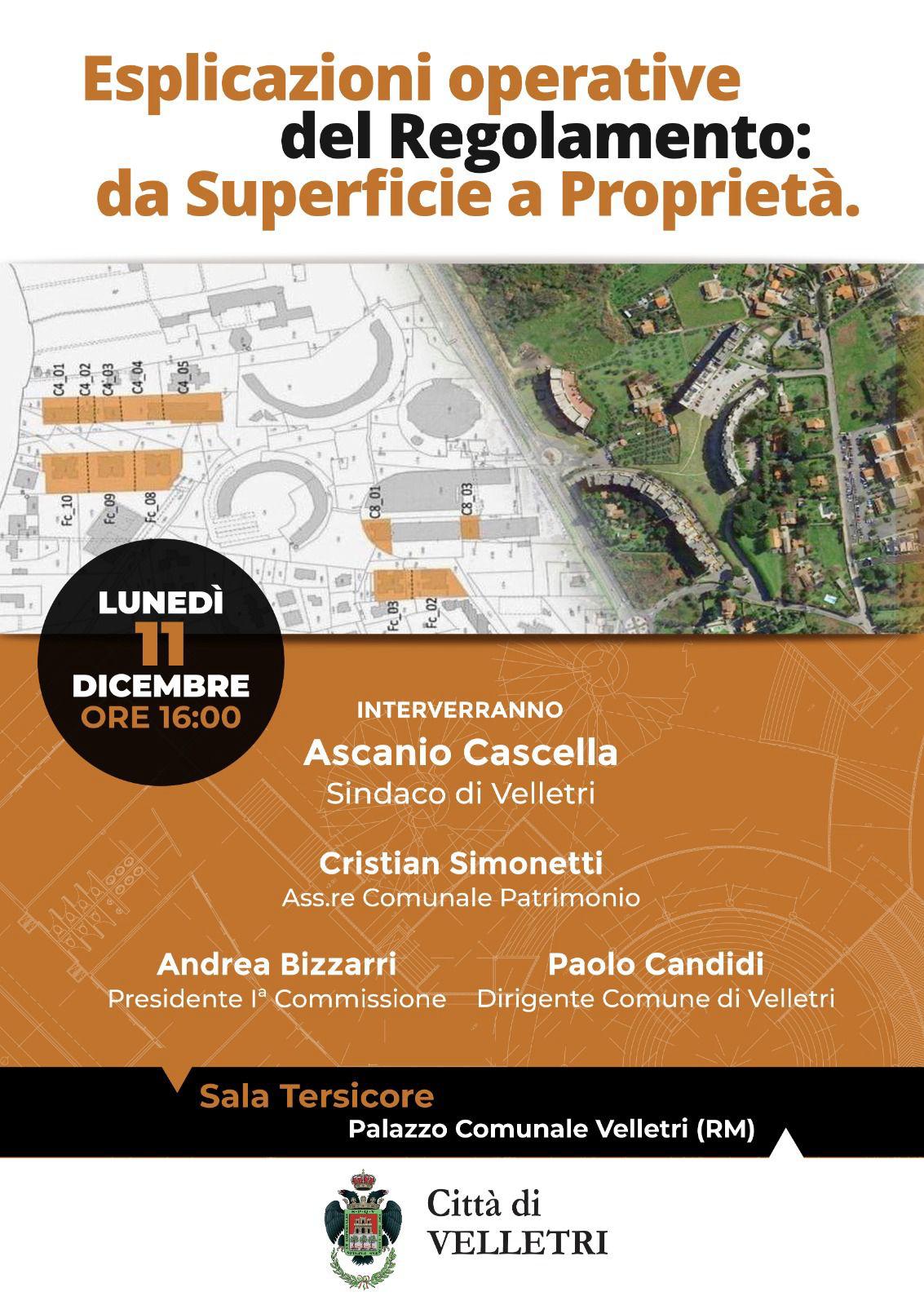 Esplicazioni operative del Regolamento: da Superficie a Proprietà. Convegno presso la sala Tersicore del Palazzo Comunale lunedì 11 dicembre, alle ore 16:00.