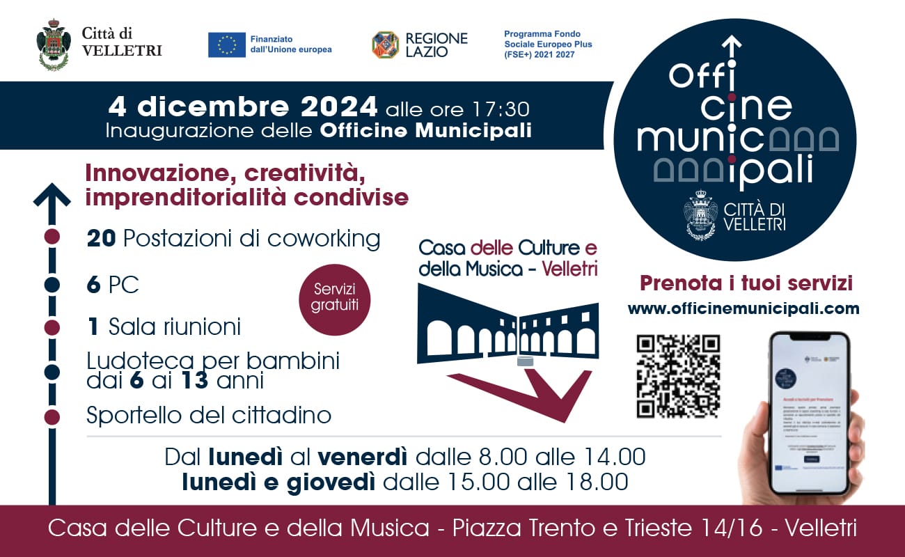 Mercoledì 4 dicembre alle ore 17.30, presso la Casa delle Culture e della Musica, ci sarà l'inaugurazione delle Officine Municipali. Un progetto che consentirà gratuitamente di fruire di postazione di coworking con annessa ludoteca.