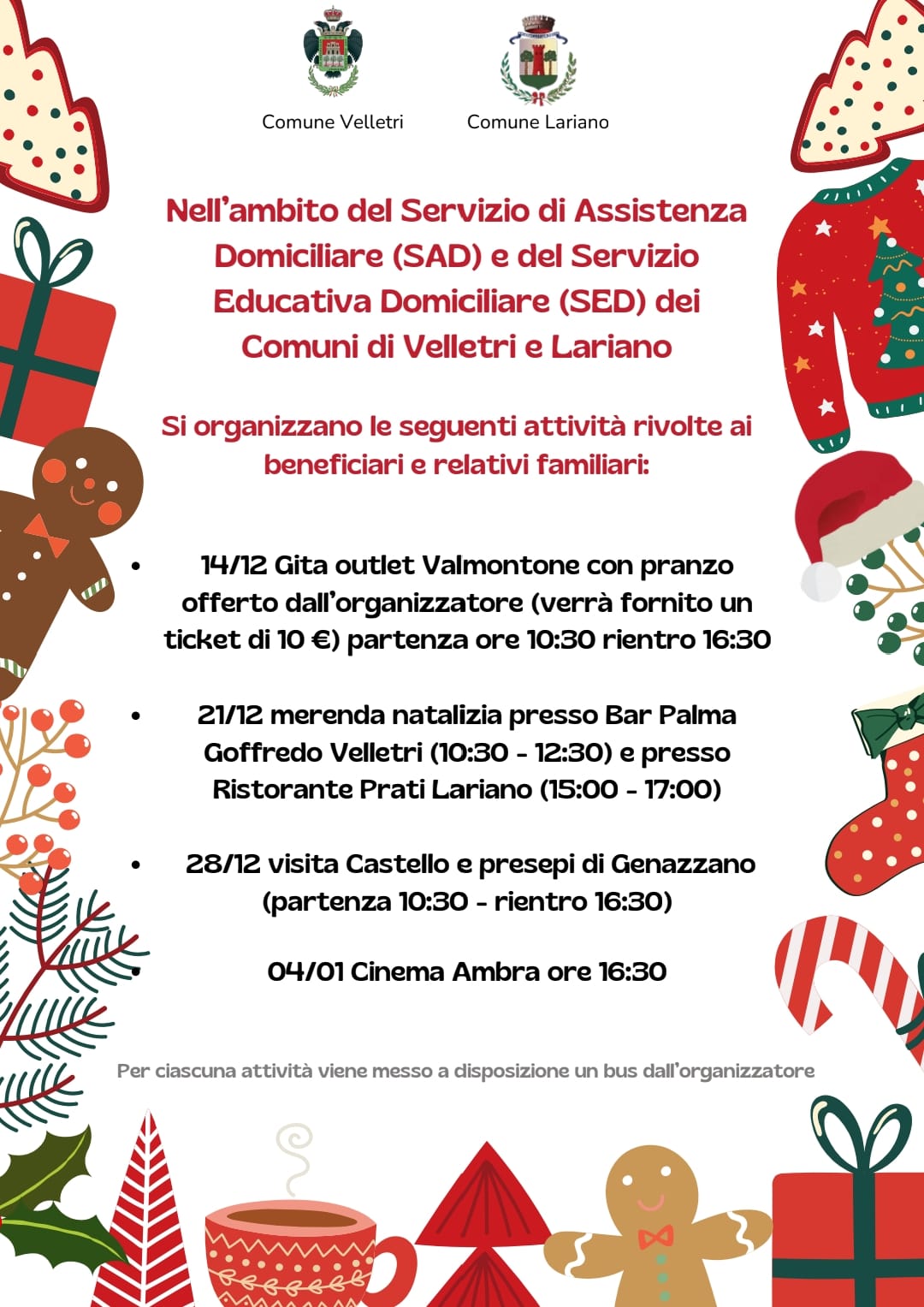 Nell'ambito del Servizio di Assistenza Domiciliare (SAD) e del Servizio Educativa Domiciliare (SED) dei Comuni di Velletri e Lariano si organizzano le attività rivolte ai beneficiari e relativi familiari riportate nella locandina