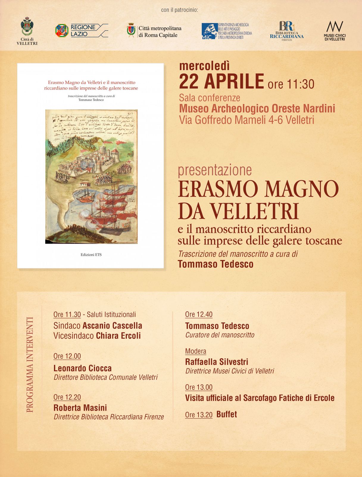 Mercoledì 22 aprile alle ore 11:30 presso la sala conferenze del Museo Archeologico O. Nardini, ci sarà la presentazione di "Erasmo Magno da Velletri e il manoscritto riccardiano sule imprese delle galere toscane".
