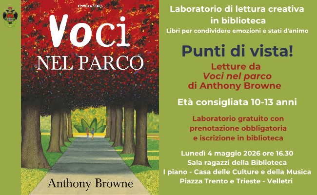 Lunedì 4 maggio 2026 alle ore 16.30 presso la Biblioteca comunale di Velletri "Augusto Tersenghi" prosegue il nuovo ciclo dei "Laboratori di lettura creativa. Storie per condividere emozioni e stati d'animo”, in collaborazione con l'Associazione Aion-Aps.